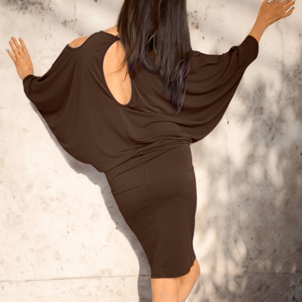 Abito in jersey elasticizzato che scopre una spalla, linea a pipistrello per la parte superiore e aderente sui fianchi. Puo' essere regolata la lunghezza drappeggiando più o meno l'abito sui fianchi, da versione "longuette" a minabito. A seconda degli accessori che usi potrai portarlo in ogni occasione. Apertura su una spalla e goccia nella schiena.