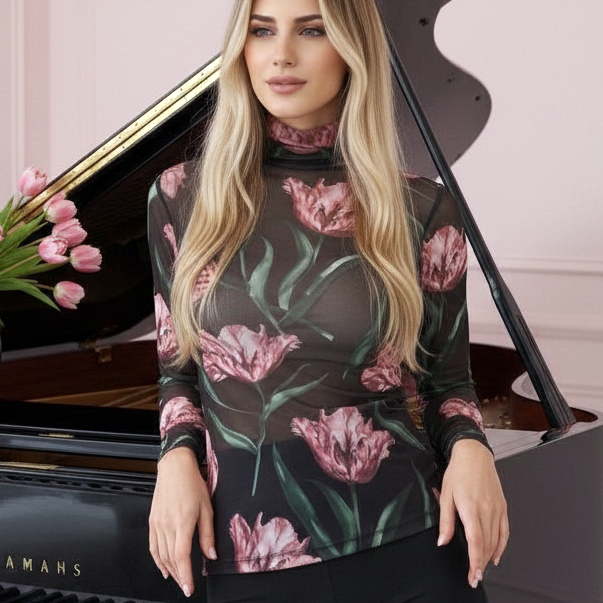 Lupetto a manica lunga in tulle elasticizzato stampato in un esclusivo disegno floreale. Linea aderente e fit molto comodo per la morbidezza ed elasticità del tessuto.