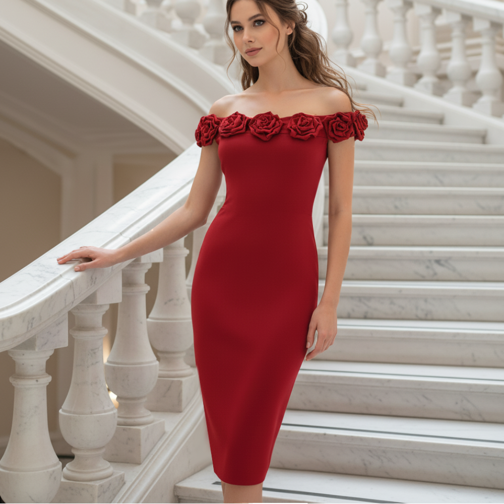 Abito a tubino spalle nude in crëpe elasticizzato adornato da una corolla di rose fatte a mano.